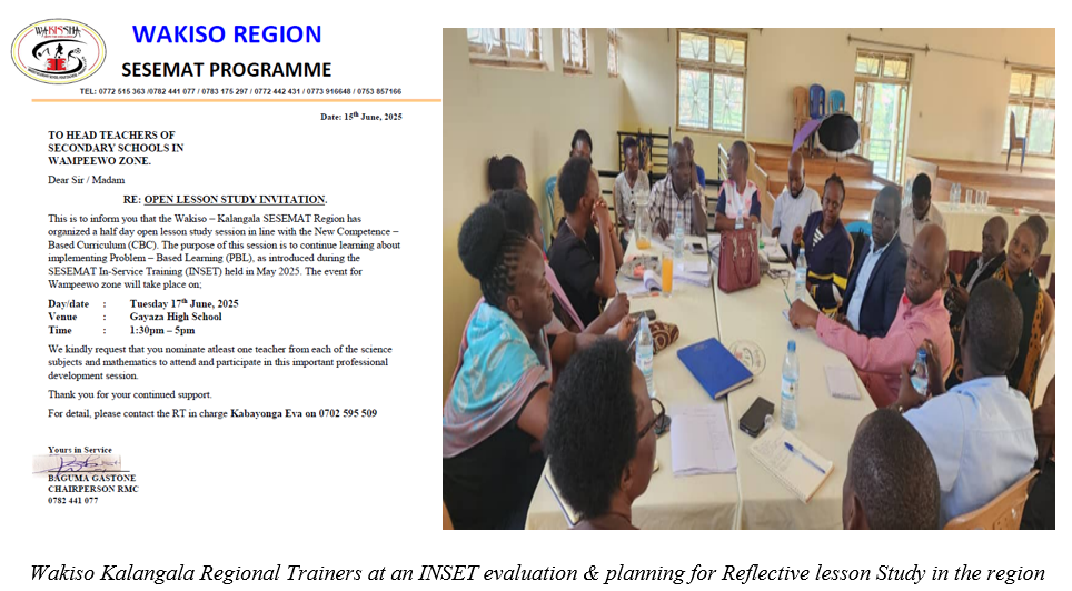 Uganda’s Secondary Science and Mathematics Teachers’ (SESEMAT) Programme strengthens STEM teaching through science fairs, INSETs, support supervision, and school-based CPDs, reaching 28 regions including Wakiso–Kalangala. With the Competency-Based Curriculum (CBC) reshaping education, many teachers face challenges in curriculum interpretation, lesson planning, project work, assessment, and managing large classes. Research shows that Continuous Professional Development (CPD) is key to addressing these gaps, with sustainable growth built on professional learning communities, mentorship, and reflective practice (Njiru & Odundo, 2023). One of the most transformative approaches is Reflective Lesson Study, a model that empowers teachers to collaboratively analyze lessons, refine pedagogy, and innovate solutions for CBC classrooms (Uştuk & De Costa, 2023). In response, SESEMAT has embraced Reflective Lesson Study as a cornerstone of its CPD support.